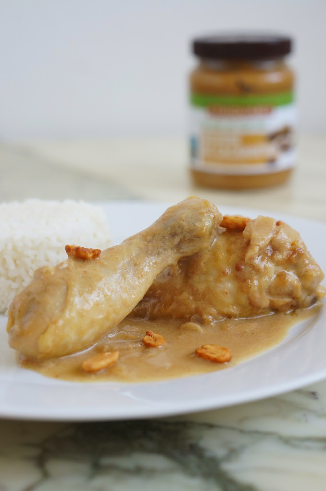 Comme beaucoup de personnes j'avais des morceaux de poulet dans mon frigo et je cherchais une recette qui change. En me promenant sur le blog de Chef Nini j'ai choisi une recette associant du lait de coco, du beurre de cacahuètes et une marinade à la sauce soja. Cette recette est facile, la sauce est très bonne et le poulet moelleux. J'ai l'habitude d'utiliser le beurre de cacahuètes avec du porc mais finalement il accompagne très bien le poulet également.