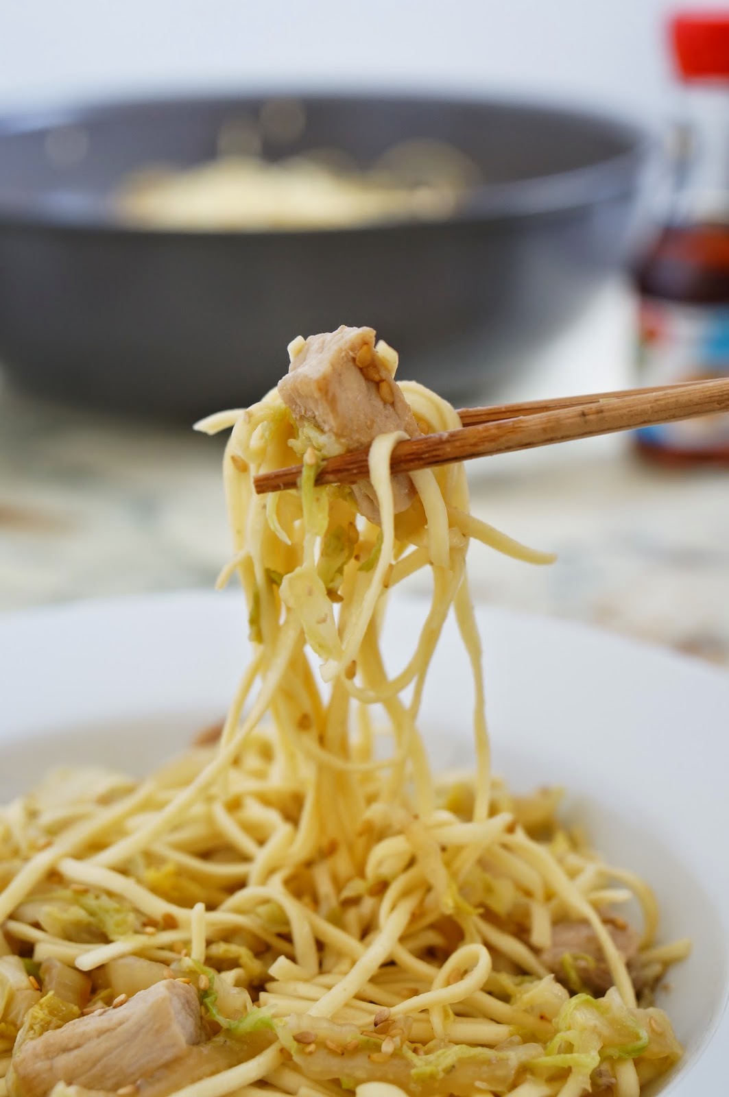 - Ajoutez les nouilles égouttées, la sauce soja, la sauce nuoc mam, le jus de citron et l'eau. Continuez la cuisson 2 minutes (pour faire chauffez les nouilles et la sauce).