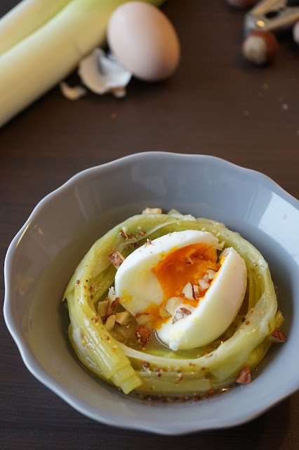 Une recette simplet et équilibrée. J'ai voulu revisité les classiques poireaux-vinaigrette de part la présentation et de part le goût avec les graines de moutarde, l'oeuf mollet et le croustillant des noisettes.
