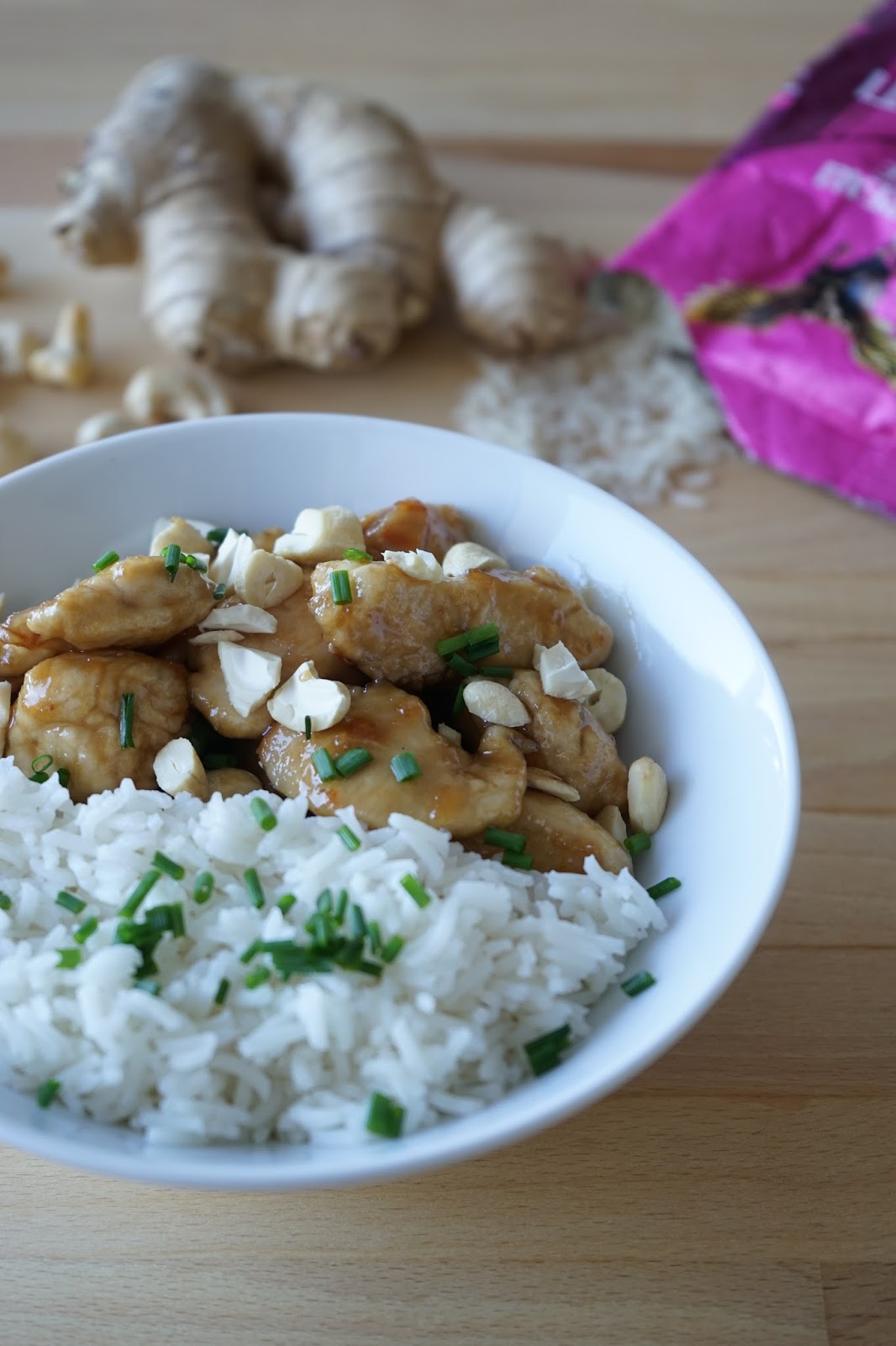 - Au moment de servir, parsemez le poulet de noix de cajou grossièrement concassées et de ciboulette ciselée.