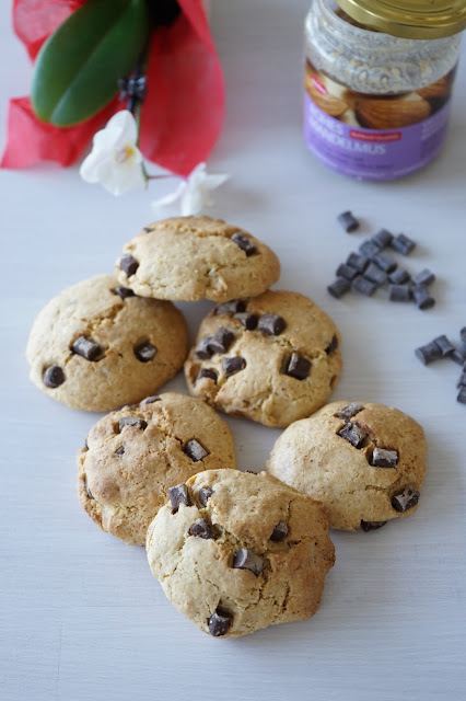 Des cookies sans beurre pour un goûter plus raisonnable, il est remplacé par la purée d'amande qui apporte un délicieux parfum à la pâte en plus des pépites de chocolat noir.