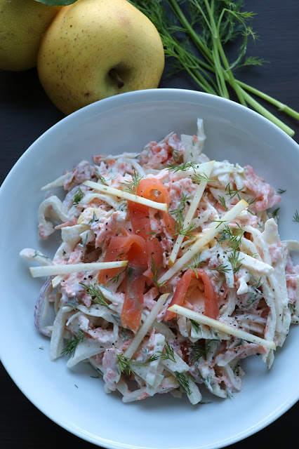 Pour terminer la semaine, je vous propose une salade avec des légumes de saison. Il s'agit d'une recette inspirée de la salade coleslaw (salade à base de chou et carottes râpés). J'ai voulu l'agrémenter de lamelles de pommes pour la douceur. Le saumon fumé apporte une note gourmande à la salade, avec une sauce au yaourt et à l'aneth.
