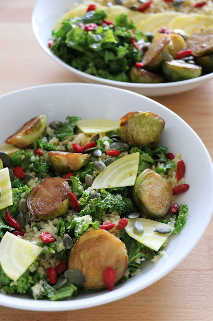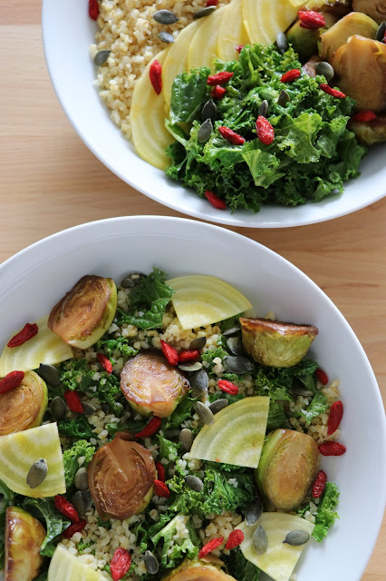 - Au moment de servir, versez le boulgour dans une assiette, ajoutez le chou kale et les choux de Bruxelles tièdes. Disposez enfin la betterave jaune, les graines de courge et les baies de goji.