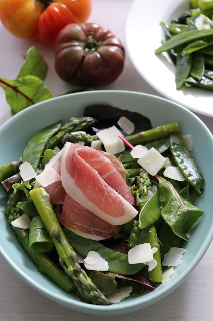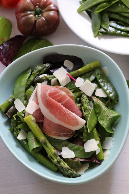 - Au moment de servir, disposez le mesclun (ou de la laitue), les pois gourmands, les asperges, le jambon sec, des copeaux de parmesan. Assaisonnez avec le vinaigre balsamique, l'huile d'olive, sel et poivre.