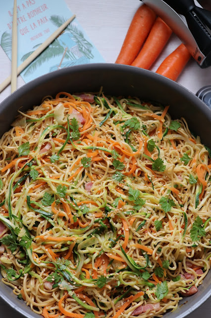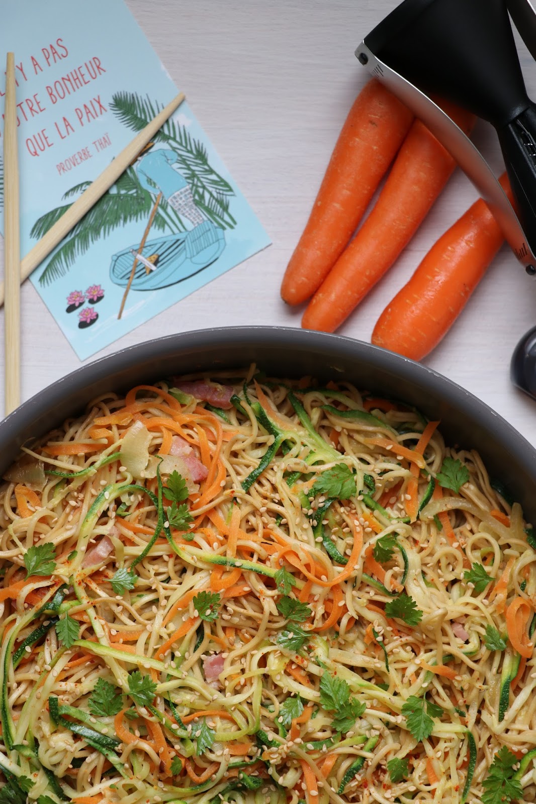 Aujourd'hui, je vous propose un plat complet avec des spaghettis de courgettes et de carottes. C'est la deuxième recette du blog dans laquelle j'utilise le spiraliseur. Vous l'aurez compris, ce gadget est devenu indispensable dans ma cuisine ! Pour les parents, avec cette recette vous pourrez faire manger des légumes à vos enfants plus facilement.