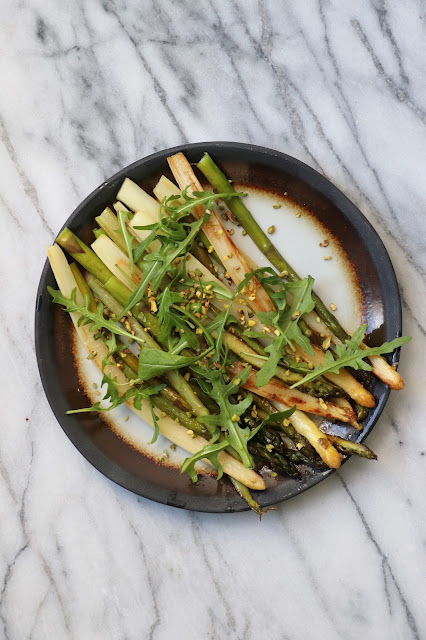 - Au moment de servir, déposez les asperges tièdes, aoutez des feuilles de roquette et des pistaches concassées. Vous pouvez ajouter de la crème de vinaigre balsamique et de la fleur de sel.