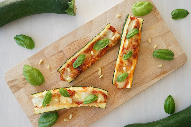 Une recette de pizza "saine" avec des courgettes à la place de la pâte. On peut trouver des recettes similaires sous le nom de "zucchini pizza boats". Avec la chaleur cette préparation permet une cuisson très rapide pour ne pas trop réchauffer la température de votre cuisine ...
