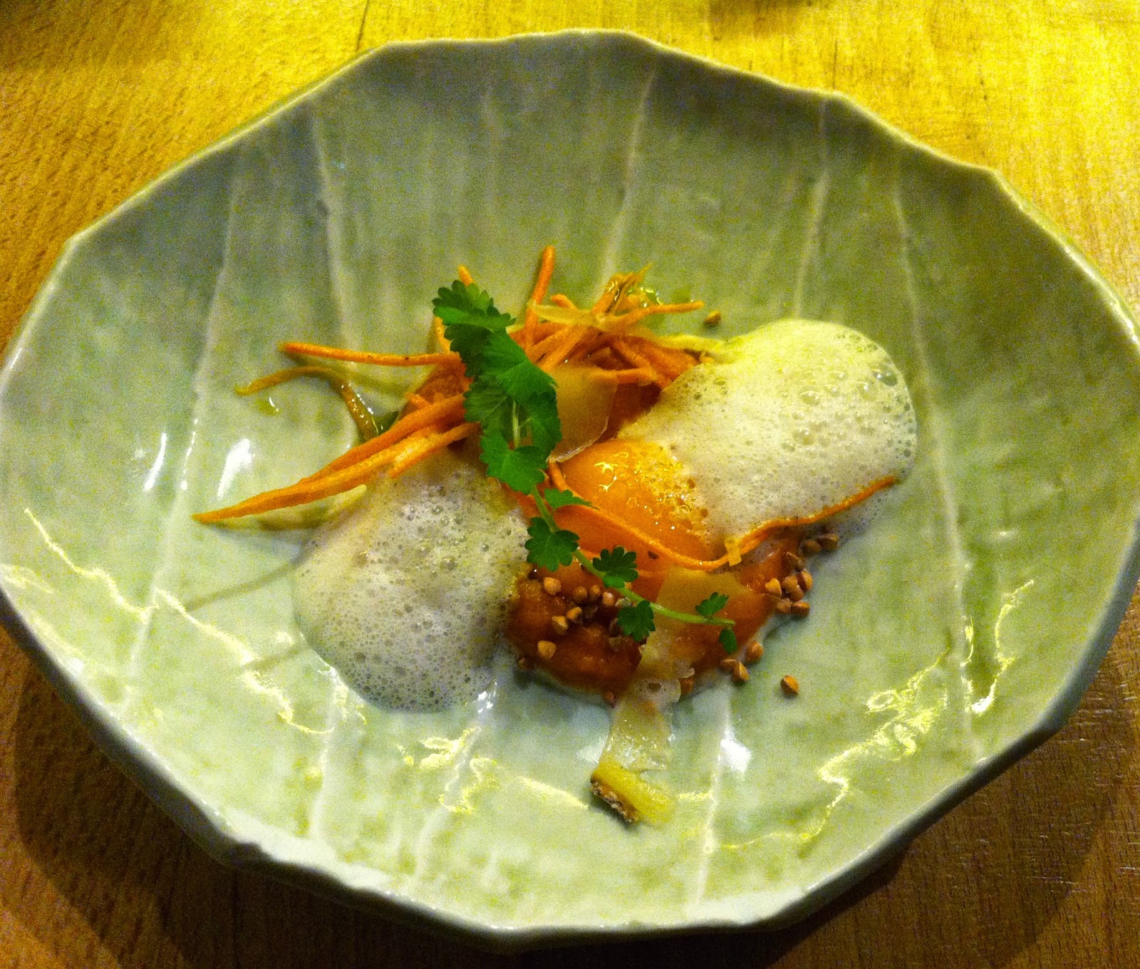 Purée de patate douce, oeuf cuit à basse température, émulsion d'échalote, abondance, amandes grillées et carottes