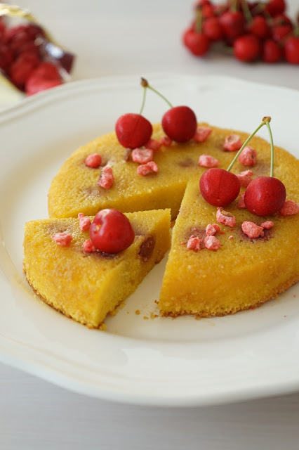 Une recette de saison avec les premières cerises ! Au départ cette recette devait être un clafoutis mais au final j'ai trouvé que la texture faisait plus gâteau. Je me suis inspirée d'une recette de Christophe Michalak, vu son niveau en pâtisserie s'il dit que c'est un clafoutis on va le croire... Bref, c'était délicieux, les cerises et la poudre d'amandes s'associent très bien ensemble. La petite note croustillante avec les pralines roses (dans la version originale, il s'agit de dragées concassés) est facultative.
