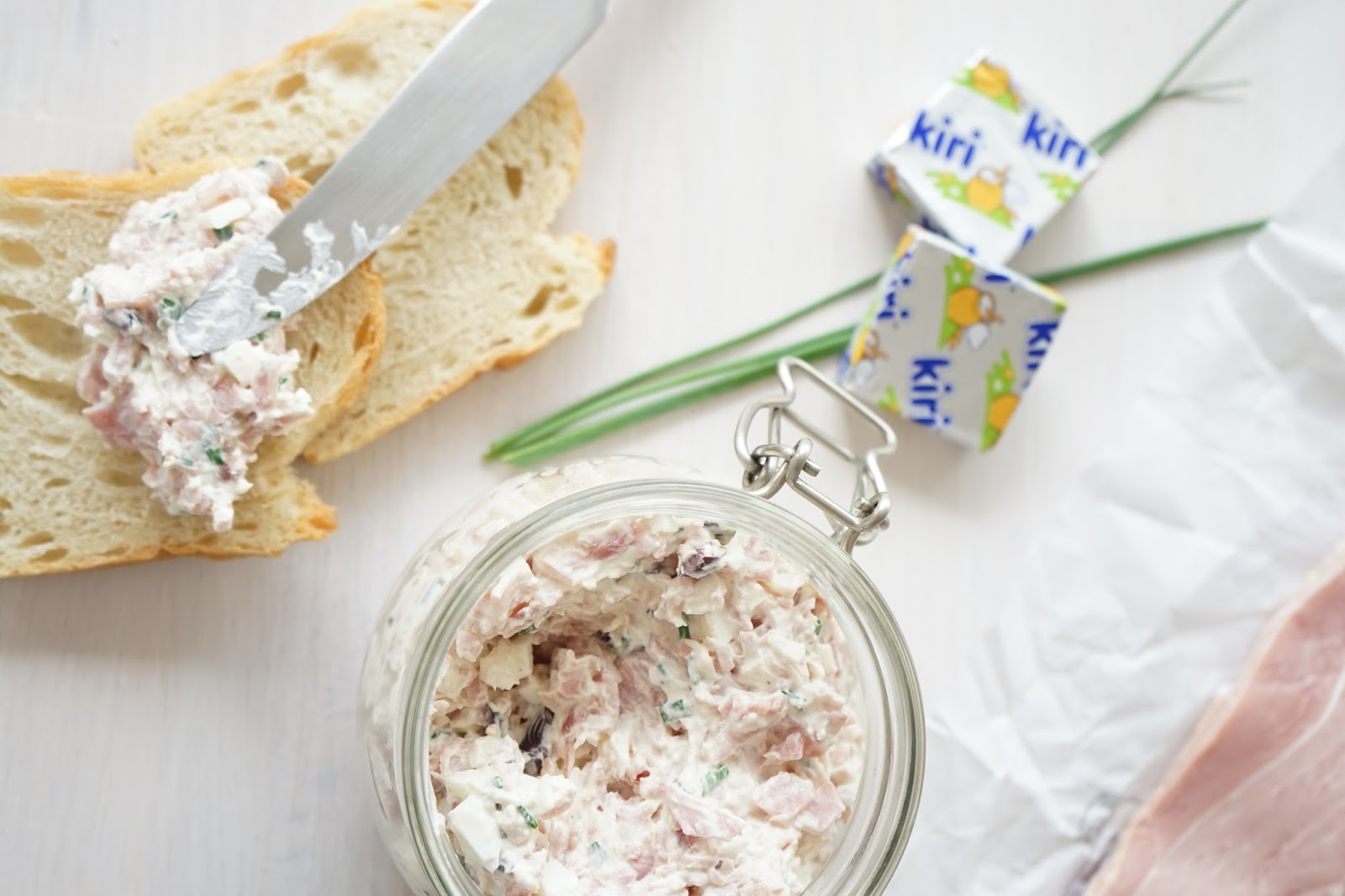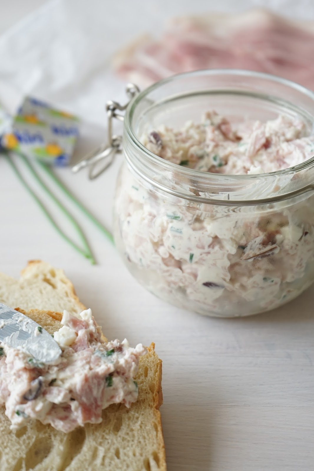 Une nouvelle recette de tartinade après les rillettes de saumon frais et fumé et la tartinade au roquefort, noix et cranberries séchées; une recette avec du jambon blanc et cru. Une préparation à déguster à l'apéro avec des tartines de pain.