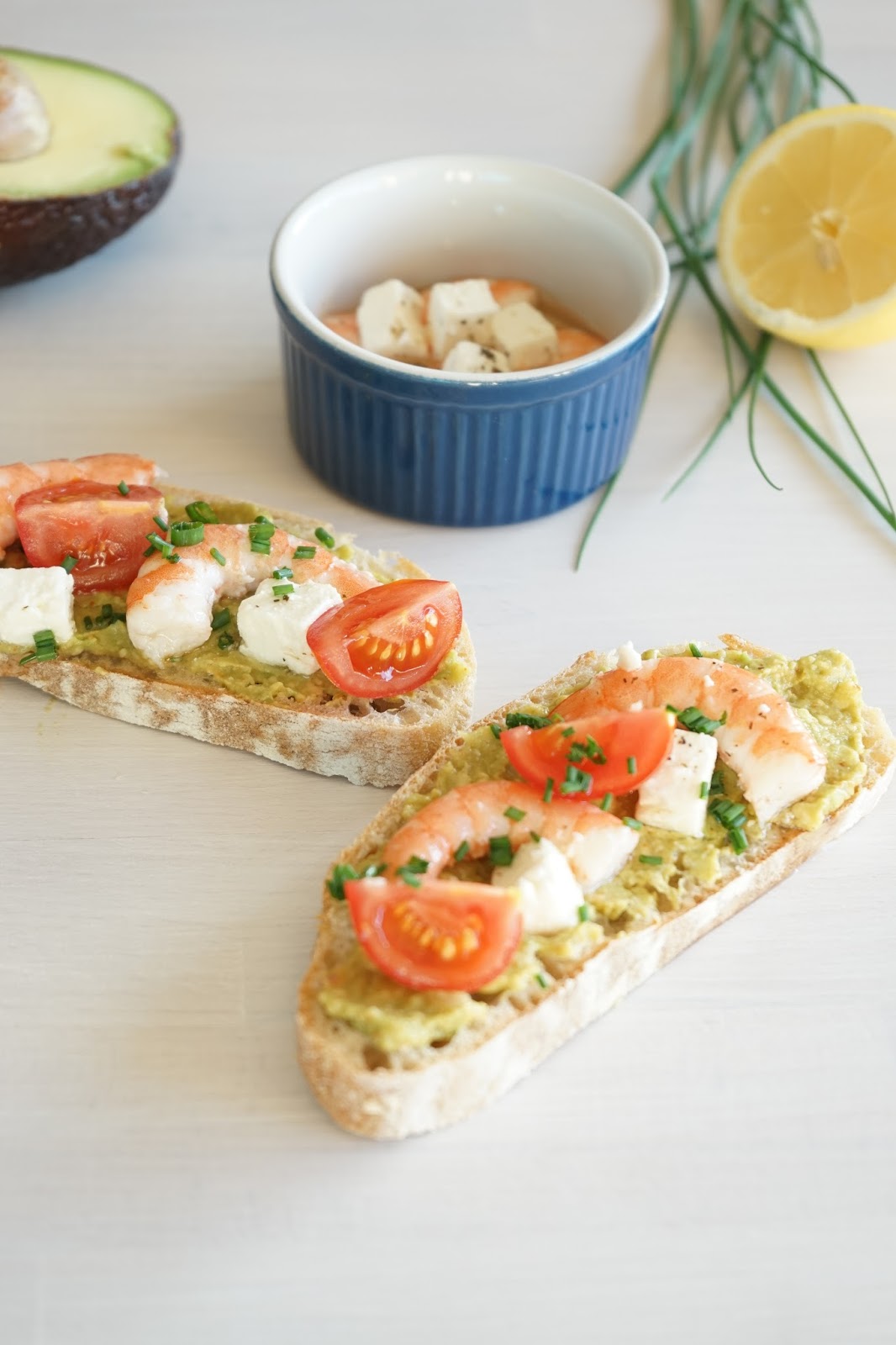 Des petites tartines colorées avec des crevettes et de l'avocat. Au départ je voulais faire des verrines et j'ai finalement opté pour des tartines, une version plus gourmande et complète.