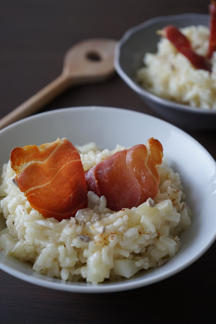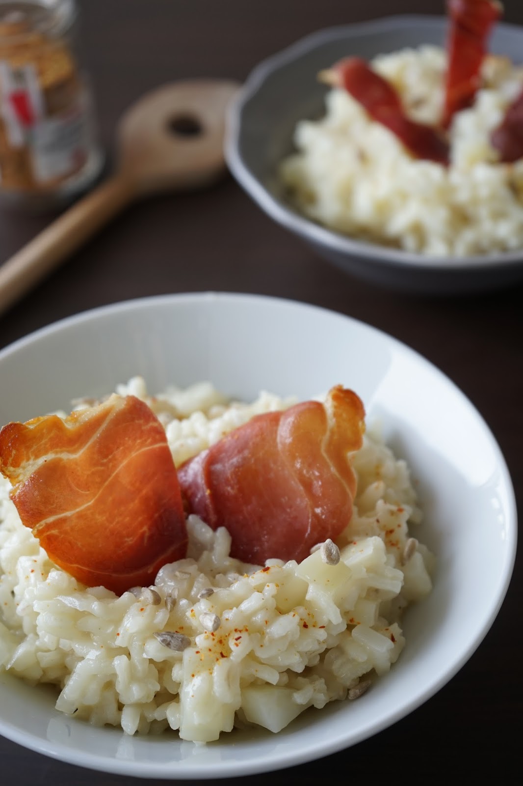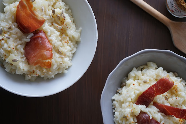 8. Disposez le risotto dans vos assiettes avec les chips de jambon, du piment d'Esplette et des graines de tournesol (facultatif).