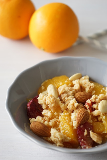 La salade de fruits manque souvent de relief et j'aime bien y ajouter une note croustillante. J'ai choisi d'utiliser seulement des oranges (navel et sanguines) marinées avec de l'eau de fleur d'oranger agrémentées d'un crumble et d'amandes entières. Le résultat est parfait, cette salade est gourmande et peut remplacer un gâteau en dessert (les calories en moins).