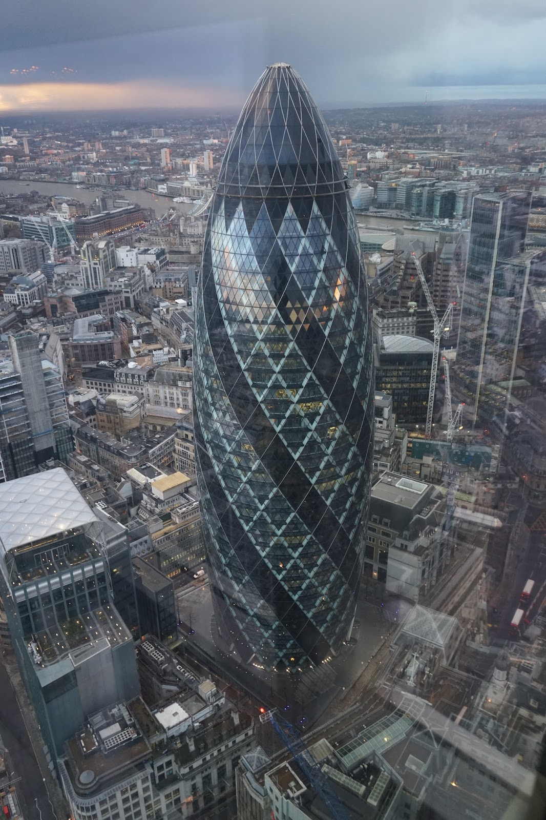 Au premier plan le fameux Cornichon, le Gherkin, haut de 180 mètres. Il est situé dans le quartier d'affaires de la City de Londres. On peut d'ailleurs l'observer d'un peu partout à Londres.