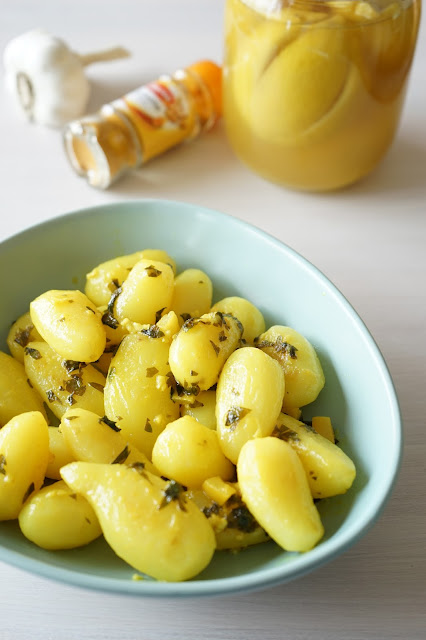 Même s'il fait chaud en ce moment et que l'on mange beaucoup de salade cette préparation à base de pommes de terre m'a donné envie. Je me suis inspirée d'une recette du blog de Paprikas. Le citron apporte de la douceur et de la légèreté. J'ai ainsi pu goûter mon premier essai de citron confit maison. La recette est très simple, le tout est d'être patient car il faut attendre plusieurs semaines pour les laisser confire tranquillement ...